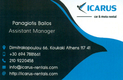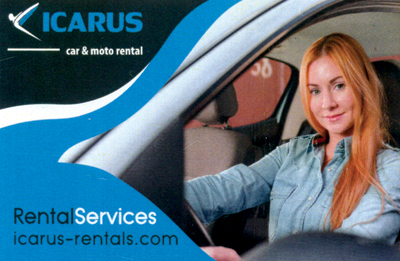 ICARUS car & moto rentals, μία εταιρία με γνώμονα τον καταναλωτή. Μέσα σε ένα ευχάριστο περιβάλλον ο Στράτος και ο Παναγιώτης θα σε βοηθήσουν να βρεις το όχημα που ταιριάζει στις ανάγκες σου, σε πραγματικά ανταγωνιστικές τιμές.