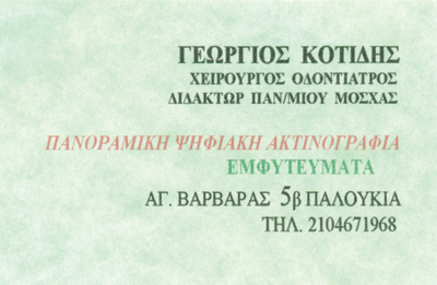 Δέχεται καθημερινά 09:00-13:00 και 17:00-21:00Σάββατο κατόπιν ραντεβού. customer tabsΕπικοινωνίαΧειρουργοί ΟδοντίατροιΥγείαΑγίας Βαρβάρας 5Β, ΣαλαμίναΣΑΛΑΜΙΝΑ ΑΤΤΙΚΗΣΠΕΙΡΑΙΑΣ ΑΤΤΙΚΗΣΑΤΤΙΚΗ21046719686974714633salamini153 [at] yahoo.gr Φωτογραφίες Facebook LikeGoogle Plus OneShare on FacebookTweet Widget